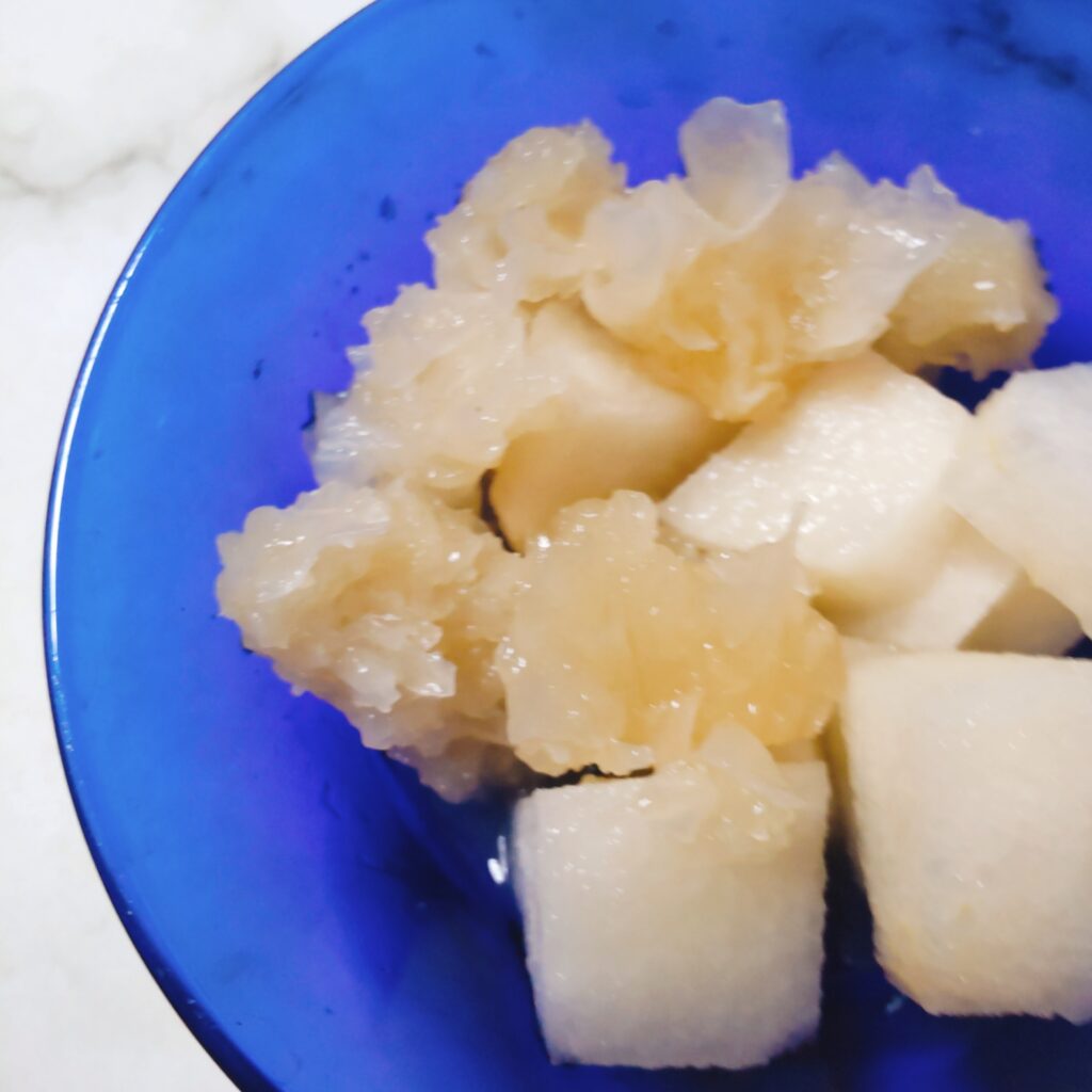 肺を乾燥から守ってくれる梨を白きくらげと一緒にシロップ煮にしました。