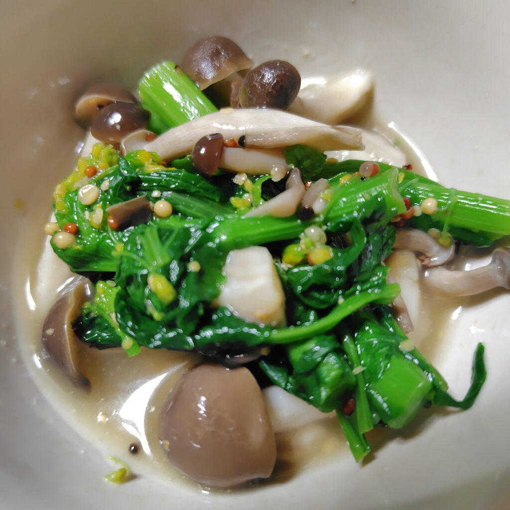 菜の花としめじの和え物粒マスタード風味